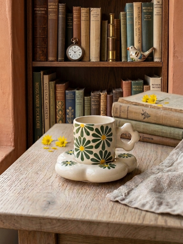 The smooth glossy finish paired with a soft cream base gives it a clean and elegant feel. The flower-shaped handle and matching saucer add a unique, artistic detail that makes this set feel special and thoughtfully designed.