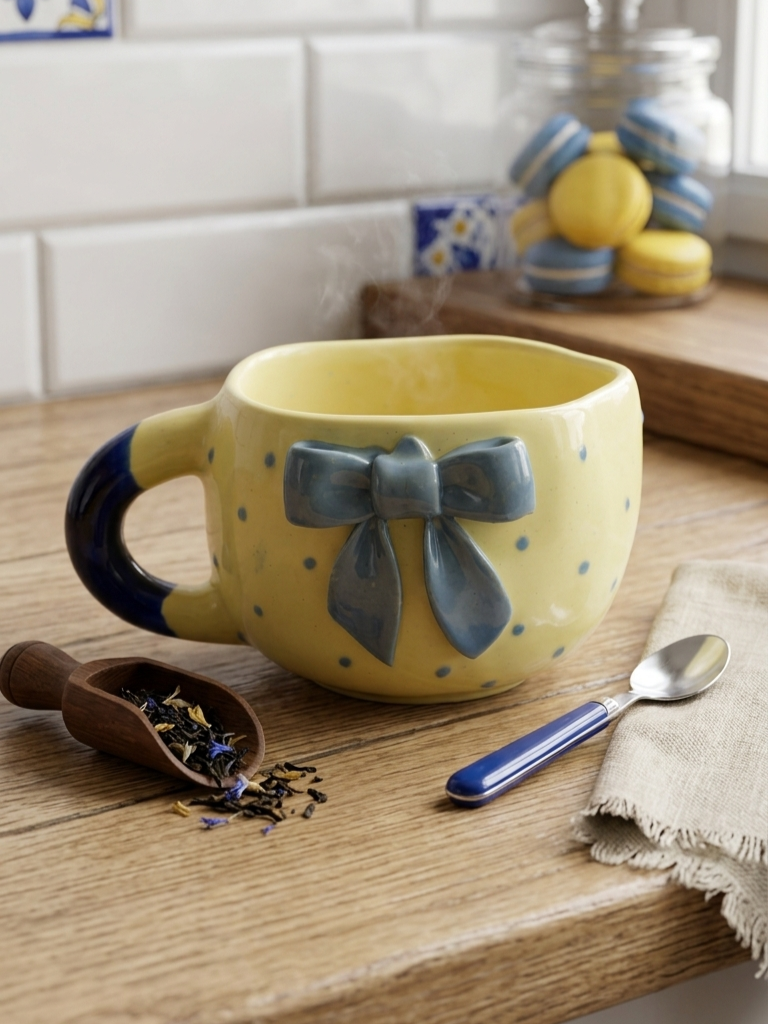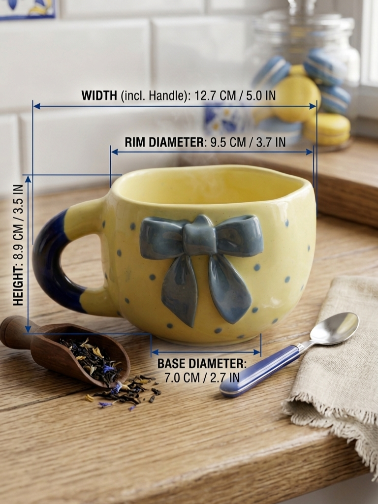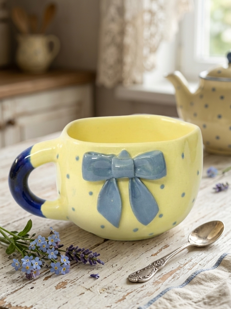 Soft, playful, and full of charm, this ceramic mug features a soothing pastel yellow base adorned with delicate polka dots and a beautifully crafted blue bow accent. The raised bow detail adds a touch of elegance and makes the mug stand out with its handcrafted feel.